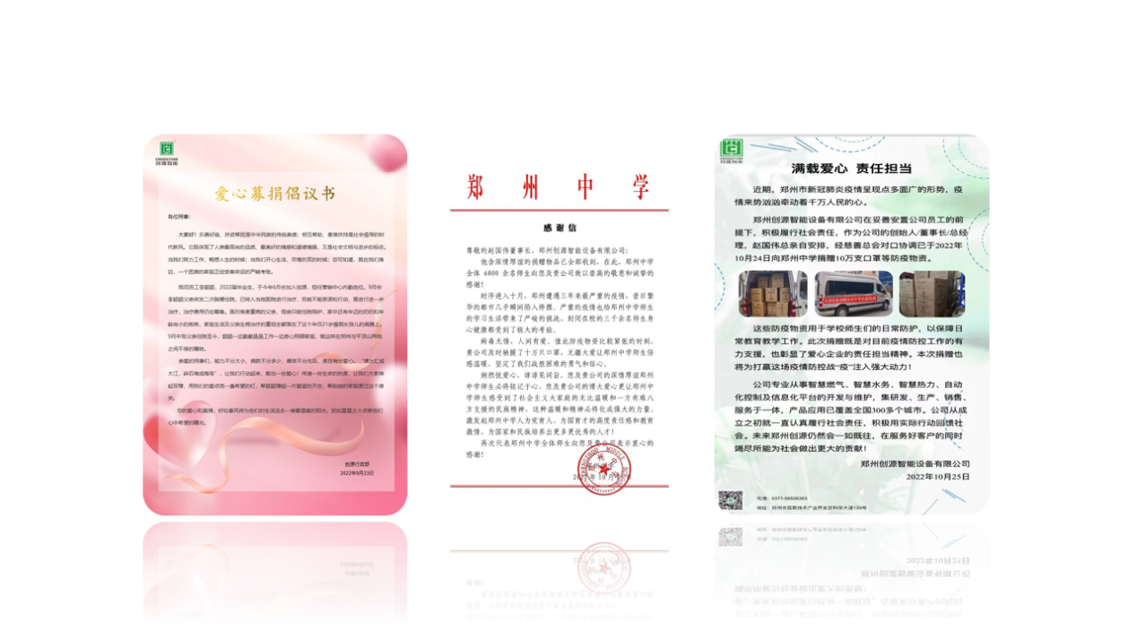 2010年公司成立之初,即向革命老區(qū)---河北省西柏坡華潤(rùn)集團(tuán)承建的紅色希望小鎮(zhèn)捐贈(zèng)無(wú)線遠(yuǎn)傳智能燃?xì)獗砑笆殖殖碓O(shè)備、運(yùn)營(yíng)軟件、電腦等價(jià)值40余萬(wàn)元的軟/硬件裝備。并舉辦愛心募捐活動(dòng)、在抗疫斗爭(zhēng)中積極捐贈(zèng)物資。